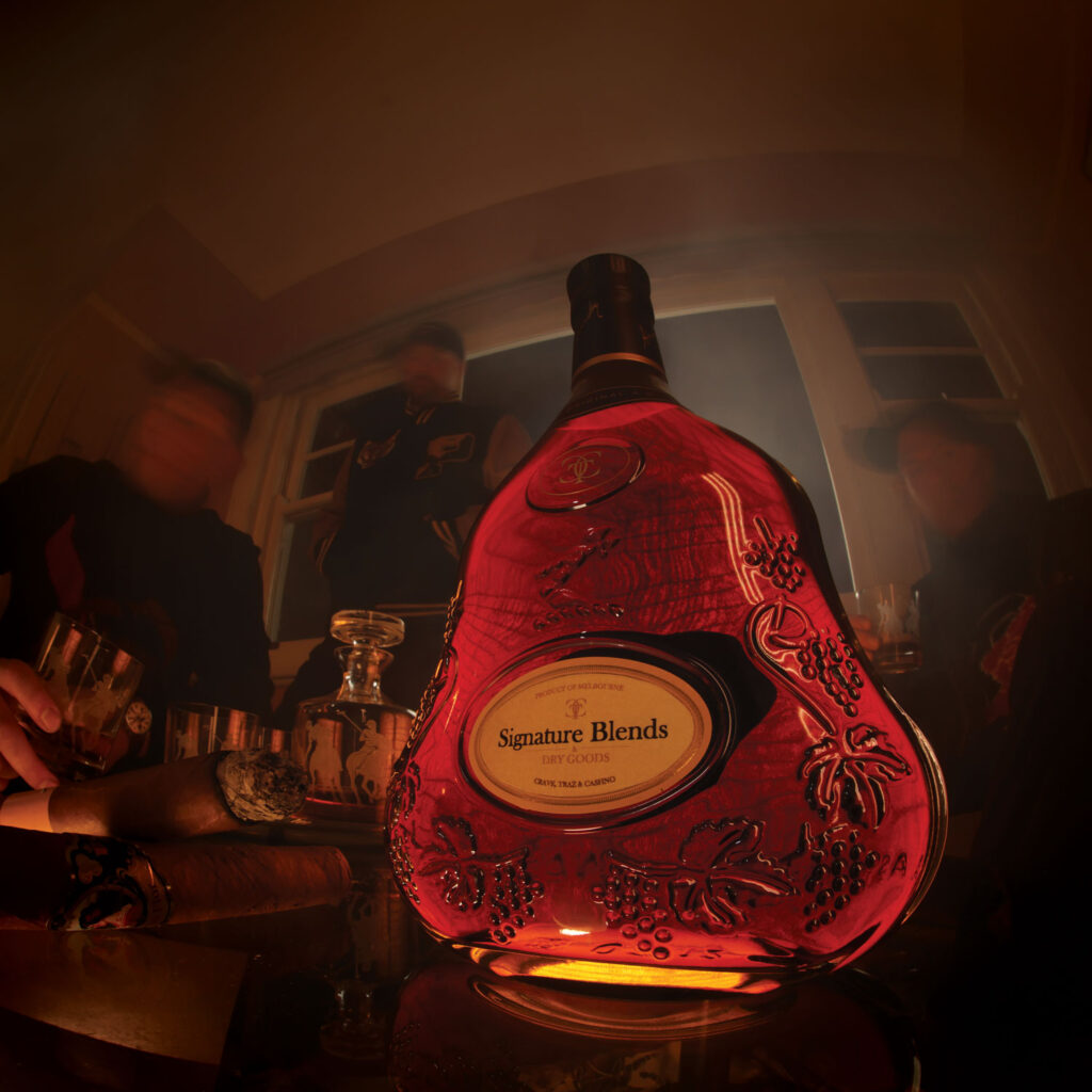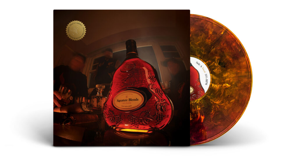 For the Crave, Traz & Cashno – Signature Blends & Dry Goods LP, I shot the cover with a long exposure to create a moody vibe with subtle movement. We added embossed, die-cut gold foil stickers for a bold, premium finish that really made the packaging stand out.